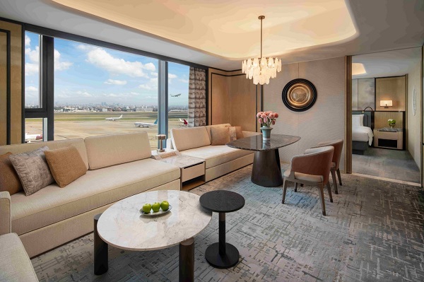 上海虹桥机场香格里拉主打“航迹间的奢华”,91间豪华客房以海派风格设计,配备4层隔音玻璃全景落地窗,客人可直观飞机起降与都市天际线;所有客房均含豪华阁专属礼遇,恒温泳池与健身房则为旅客提供放松空间。餐饮方面,米其林星厨杨小虎主理的“香聚江南灶”,以新江南概念诠释苏浙菜,还推出“一饭盒封神”打包服务,方便旅客带招牌菜登机。此外,近3000平方米宴会空间可作为进博会延伸场地,提供住宿、会议一体化服务,“跑道旁的婚礼殿堂”还能满足特殊场景需求。